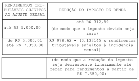“Art. 3º-A A partir do mês de janeiro do ano-calendário de 2026, será concedida redução do imposto sobre os rendimentos tributáveis sujeitos à incidência mensal do imposto de renda das pessoas físicas, de acordo com a seguinte tabela: