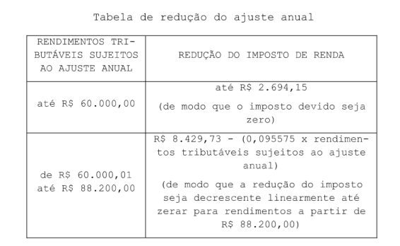 Art. 11-A. A partir do exercício de 2027, ano-calendário de 2026, será concedida redução do imposto de renda das pessoas físicas anual, apurado sobre os rendimentos tributáveis sujeitos ao ajuste anual, de acordo com a seguinte tabela: