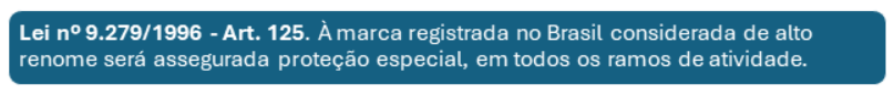 A Lei de Propriedade Industrial (LPI) veda o uso indevido de marcas de alto renome, cuja proteção ultrapassa a classe em que estão registradas e se estende a todos os segmentos de mercado (art. 125 da LPI).