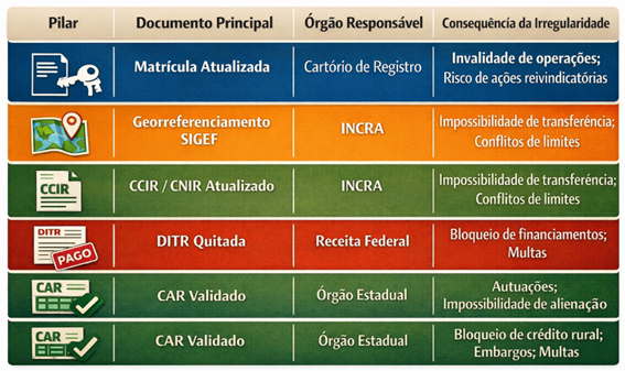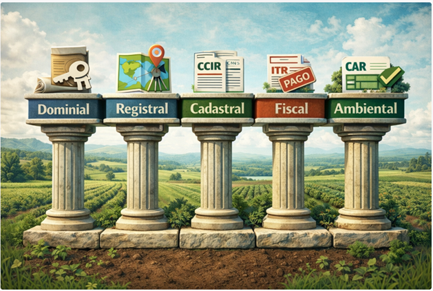 A regularização fundiária rural efetiva exige abordagem multidimensional que integre aspectos dominiais, registrais, cadastrais, fiscais e ambientais.