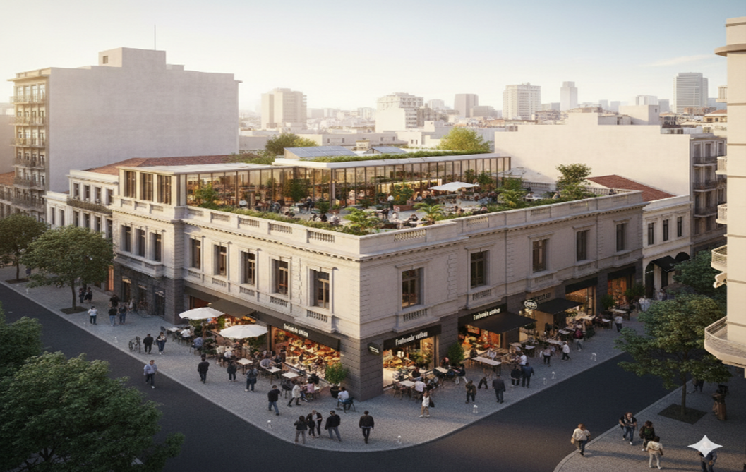 Fachadas ativas: térreo com comércio/serviços que interagem com a rua. Natural para edifícios em esquinas movimentadas. O desafio é gestão do mix — cafeteria sofisticada valoriza edifício residencial premium; comércio incompatível pode depreciar.